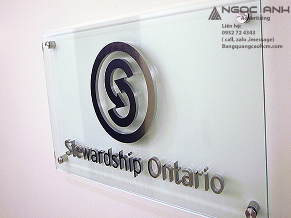 Bảng tên công ty chất liệu kính này thể hiện sự sang trọng nhờ độ trong suốt của kính, nội dung thường là chữ nổi mica,inox hoặc dán decal. Phần nền có thể để trong, hoặc dán, sơn các màu.